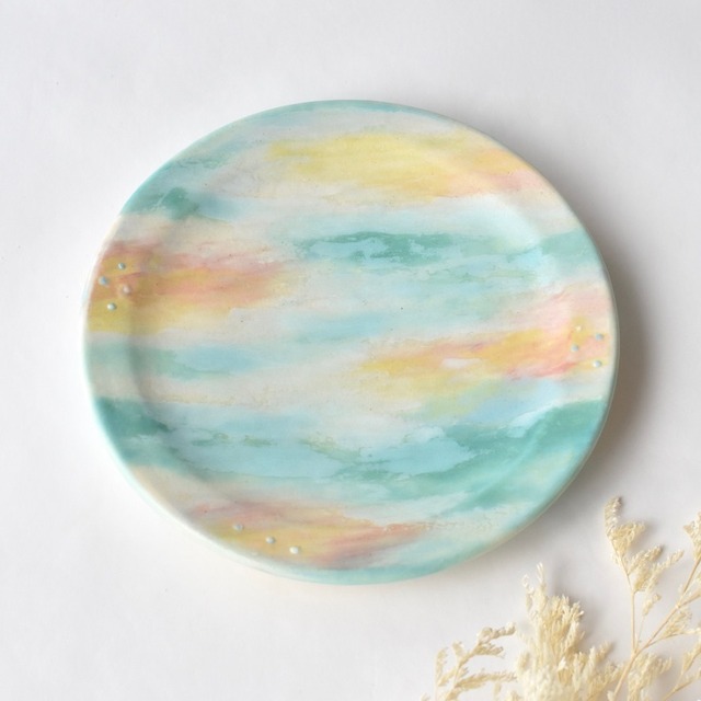水彩画のような淡い色彩を施した 陶器のお皿です。 朝の空や 光がきらきらと静かに降りてくるような、 空気にも淡い色がついているような時間や 光景を思い描いています。 裏面にも装飾を施しています。 淡い色彩の様子や小さなドット模様など ゆっくりとお楽しみいただければと思います。 【サイズ】直径約17cm 高さ約2cm 【素材】ブレンド白土 両面に施釉をしています。 光沢を抑えた上品な風合いとなっています。 ・焼成の際に土に含まれている鉄分が反応し表面に黒い点となって現れることがあります。また、釉薬のかかった器には、ピンでついたような小さな陥没(ピンホール)がみられる事があります。釉薬をかけた際、生地についた有機物が焼かれ小さなへこみとなる現象です。陶器特有の現象であり、味わいのポイントとしてお楽しみください。 ・陶器には吸水性があり、使い込むほどに色が変化していくという性質があります。時と共に変化していく器の風合いをお楽しみください。 ・オーブン、直火でのご使用は破損の恐れがあり危険です。 ・電子レンジ、食洗機のご使用は陶器を長くお使いいただく為にもおすすめはしておりません。 ・お客様都合による返品には応じておりませんのでご了承下さい。 ・お使いの液晶画面の明度、部屋の明るさなどの環境により、写真と実物では多少色合いが異なる可能性がございます。 一点一点手作業で成型・装飾を施しています。 全て一点物として販売しております。 インスタグラム https://www.instagram.com/maier_room