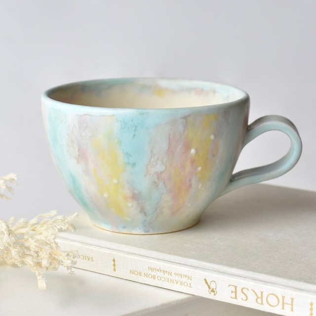 優しい色彩を施した陶器のカップです。 ふんわりとした淡い色彩の 夢の中にいるようなイメージで制作しました。 重なり合う色彩の様子や小さなドットの装飾など ゆっくりとお楽しみいただければと思います。 【サイズ】直径約9.5cm 高さ約8.2cm 【素材】ブレンド白土 【容量】満水約200ml 両面に施釉をしています。 光沢を抑えた上品な風合いとなっています。 ・作品にはピンでついたような小さな陥没(ピンホール)がみられる事があります。釉薬をかけた際、生地についた有機物が焼かれ小さなへこみとなる現象です。また、陶器の原料となる土には鉄分が含まれており、焼成の際に鉄分が反応し表面に黒い点となって現れることがあります。 陶器特有の現象であり、味わいのポイントとしてお楽しみください。 ・陶器には吸水性があり、使い込むほどに色が変化していくという性質があります。時と共に変化していく器の風合いをお楽しみください。 ・オーブン、直火でのご使用は破損の恐れがあり危険です。 ・電子レンジ、食洗機のご使用は陶器を長くお使いいただく為にもおすすめはしておりません。 ・お客様都合による返品には応じておりませんのでご了承下さい。 ・お使いの液晶画面の明度、部屋の明るさなどの環境により、写真と実物では多少色合いが異なる可能性がございます。 一点一点手作業で成型・装飾を施しています。 全て一点物として販売しております。 インスタグラム https://www.instagram.com/maier_room