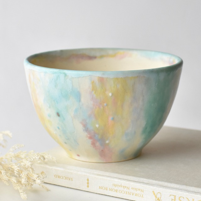 水彩画のような淡い色彩を施した 陶器のうつわです。 朝の空や 光がきらきらと静かに降りてくるような、 空気にも淡い色がついているような時間や 光景を思い描いています。 見る面によってそれぞれ表情の異なる装飾を施しています。 側面の小さなドットの装飾や 重なり合う色彩の様子など ゆっくりとお楽しみいただければと思います。 【サイズ】直径約11.6cm 高さ約7cm 【素材】ブレンド白土 両面に施釉をしています。 光沢を抑えた上品な風合いとなっています。 ・焼成の際に土に含まれている鉄分が反応し表面に黒い点となって現れることがあります。また、釉薬のかかった器には、ピンでついたような小さな陥没(ピンホール)がみられる事があります。釉薬をかけた際、生地についた有機物が焼かれ小さなへこみとなる現象です。陶器特有の現象であり、味わいのポイントとしてお楽しみください。 ・陶器には吸水性があり、使い込むほどに色が変化していくという性質があります。時と共に変化していく器の風合いをお楽しみください。 ・オーブン、直火でのご使用は破損の恐れがあり危険です。 ・電子レンジ、食洗機のご使用は陶器を長くご使用いただく為にもおすすめしておりません。 ・お客様都合による返品には応じておりませんのでご了承下さい。 ・液晶画面の明度、部屋の明るさなどの環境により、写真と実物では多少色合いが異なる可能性がございます。 一点一点手作業で成型・装飾を施しています。 全て一点物として販売しています。 インスタグラム https://www.instagram.com/maier_room