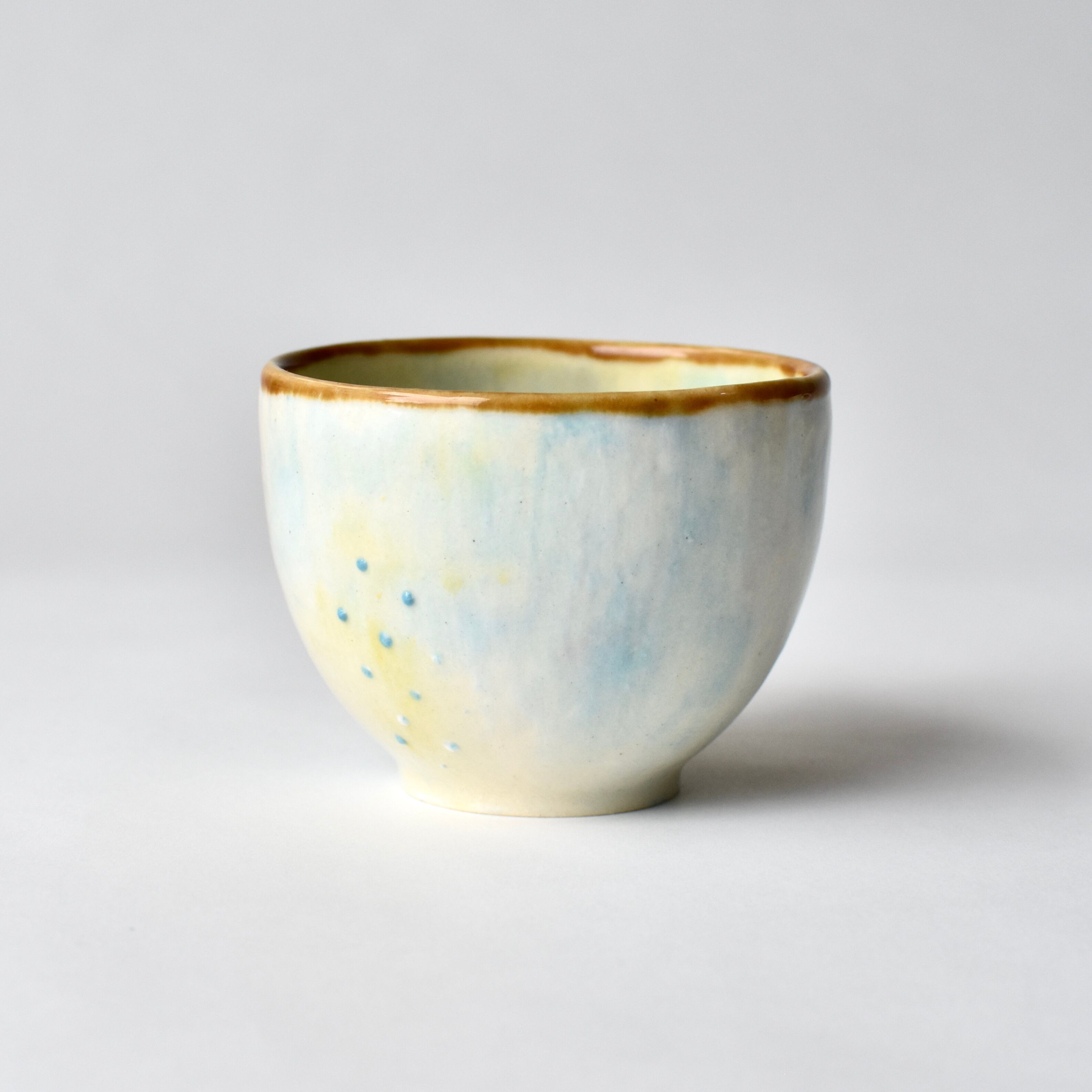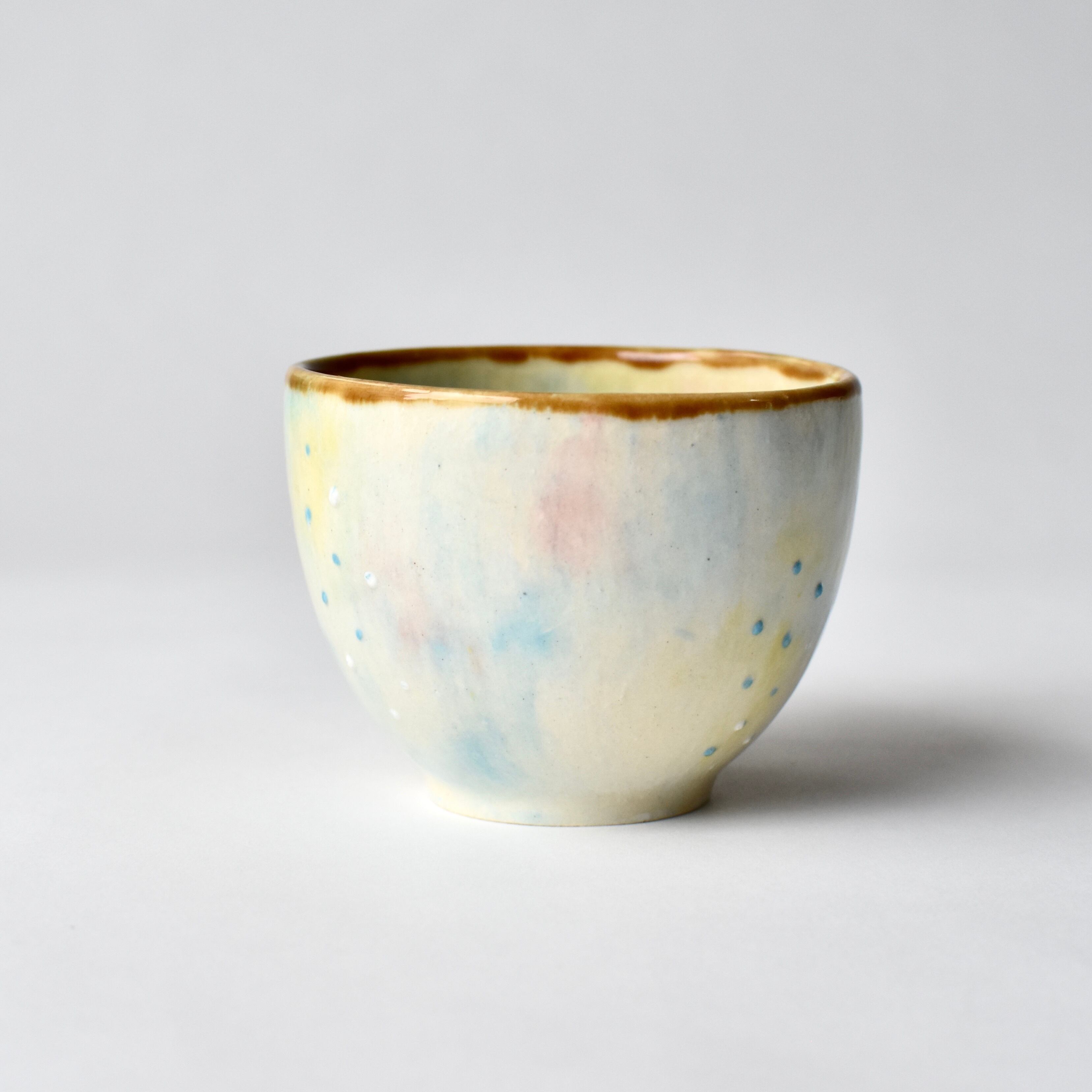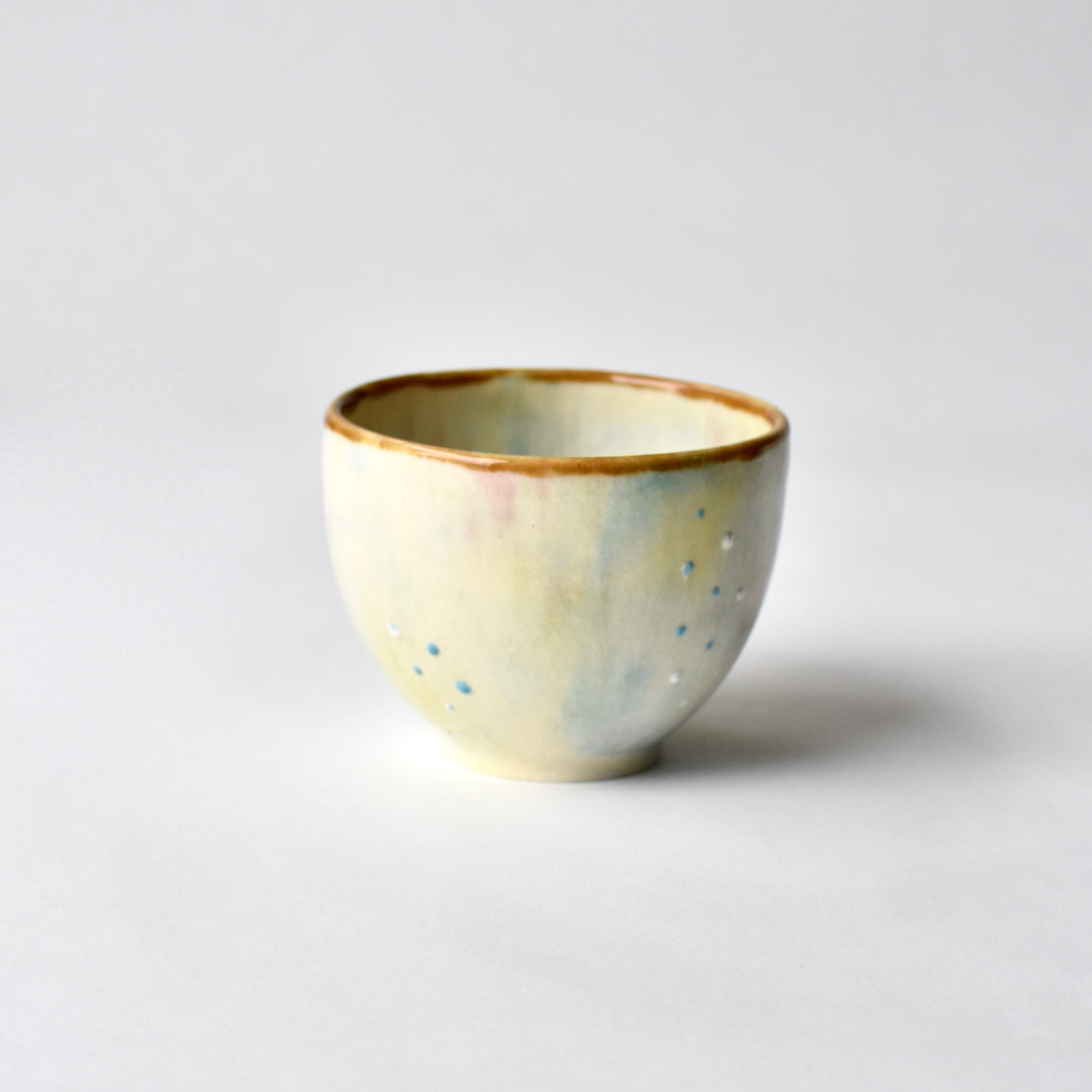 水彩画のような優しい色合いの陶器の小さなカップ(おちょこサイズ)です。